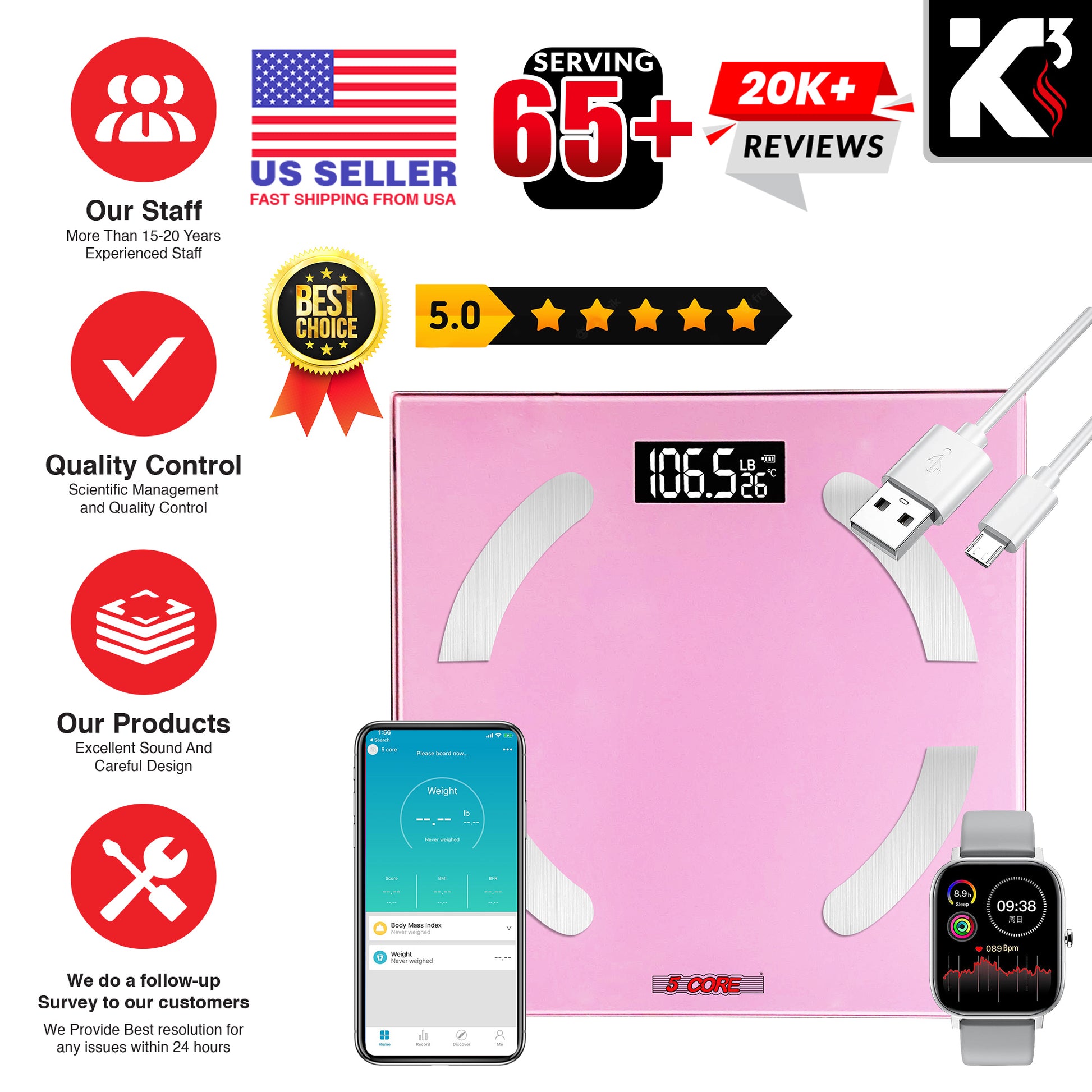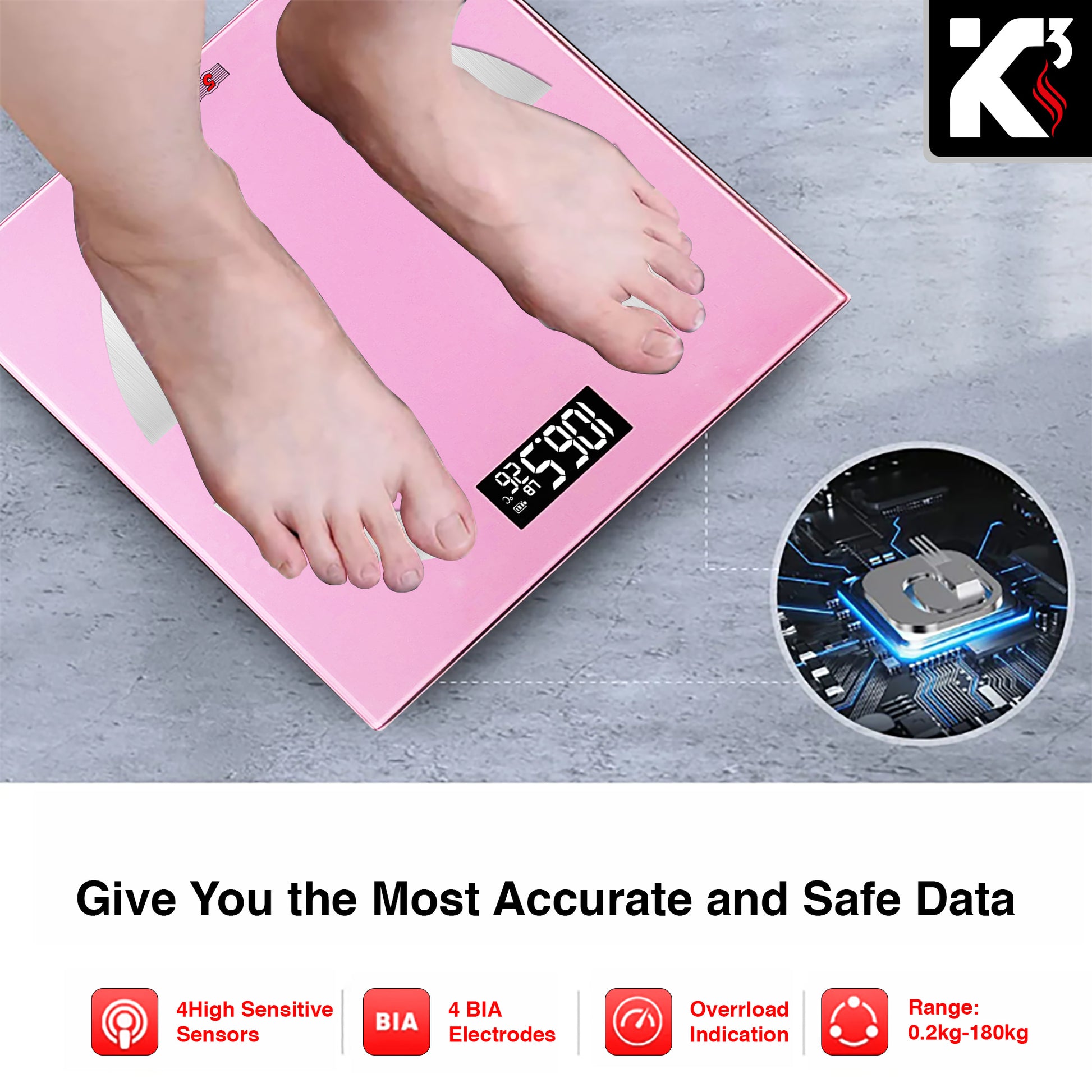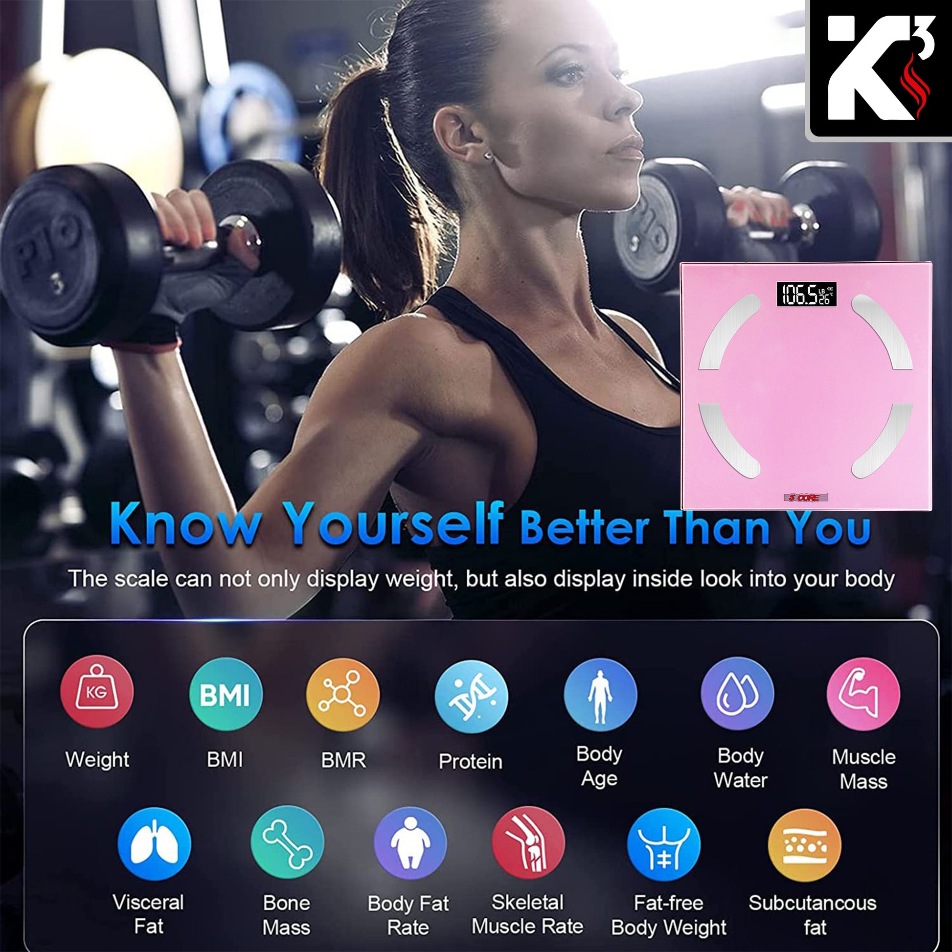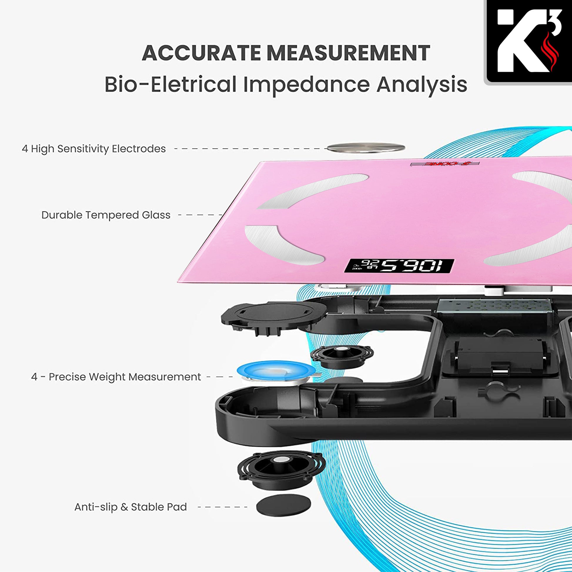 Kcubeinc Rechargeable Smart Digital Bathroom Weighing Scale with Body Fat and Water Weight for People, Bluetooth BMI Electronic Body Analyzer Machine, 400 lbs. BBS 03 R PNK