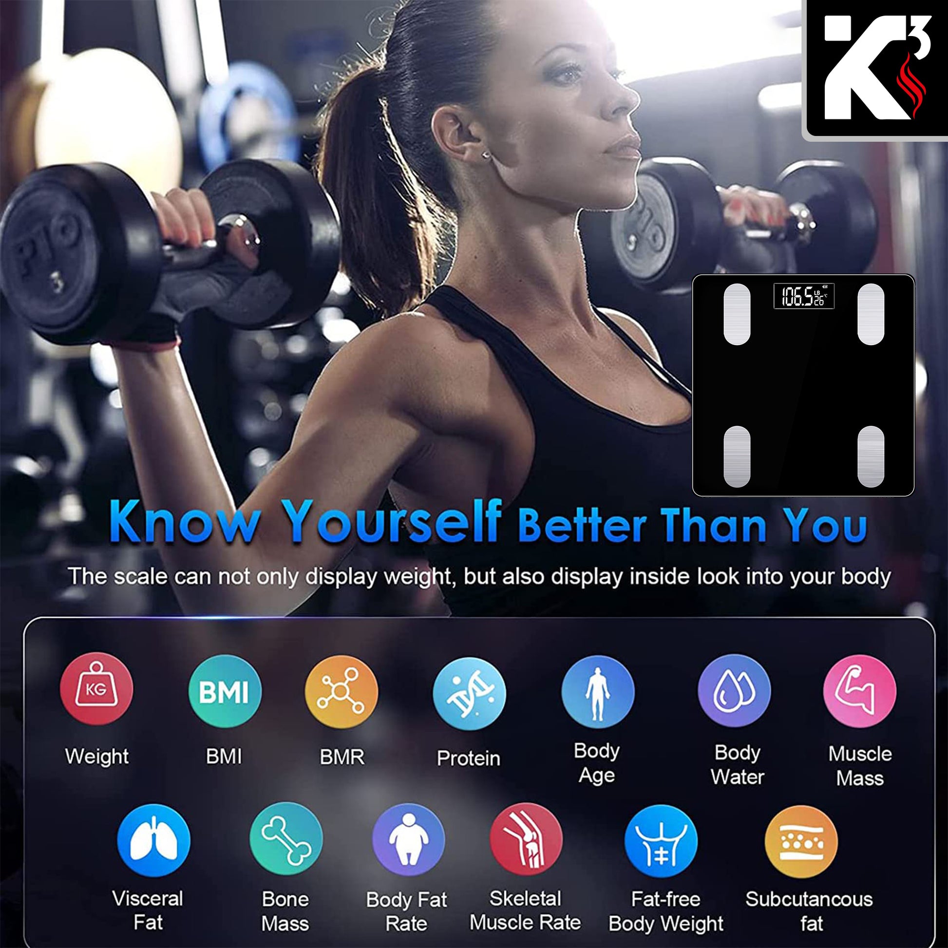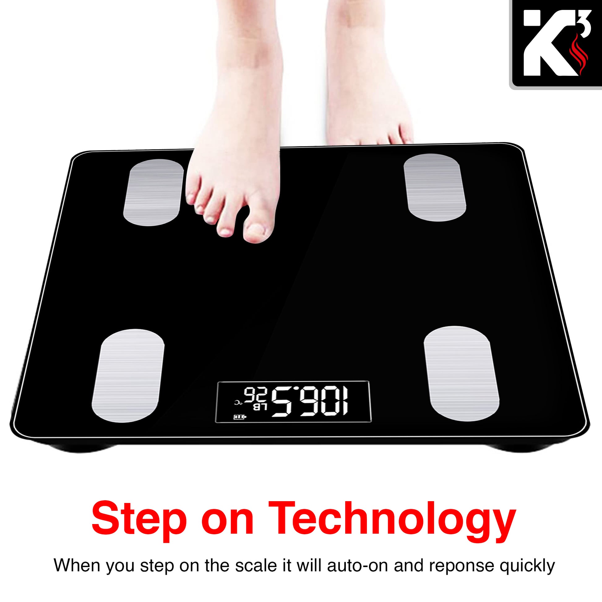 Kcubeinc Smart Digital Bathroom Weighing Scale with Body Fat and Water Weight for People, Bluetooth BMI Electronic Body Analyzer Machine, 400 lbs. BBS VL B BLK