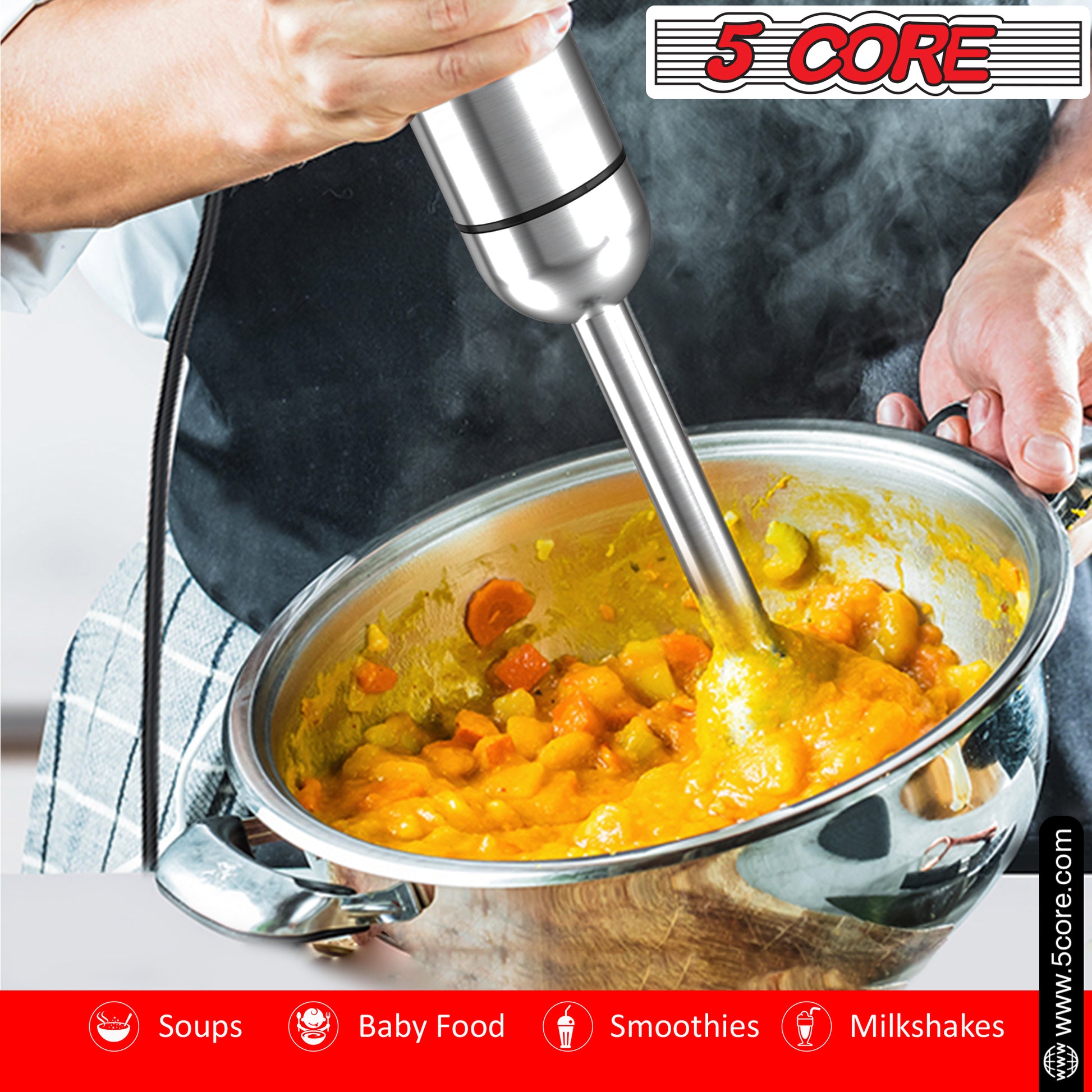 A Smart Appliance:Save time, resources, and effort with a multi-functional hand blender. The bell-shaped blending base reduces suction and splashing, allowing you to blend and puree in less time and whisk and chop in seconds. With convenient hook storage and easy-to-detach, dishwasher-safe attachments, this handheld immersion blender is the smart choice for your kitchen.