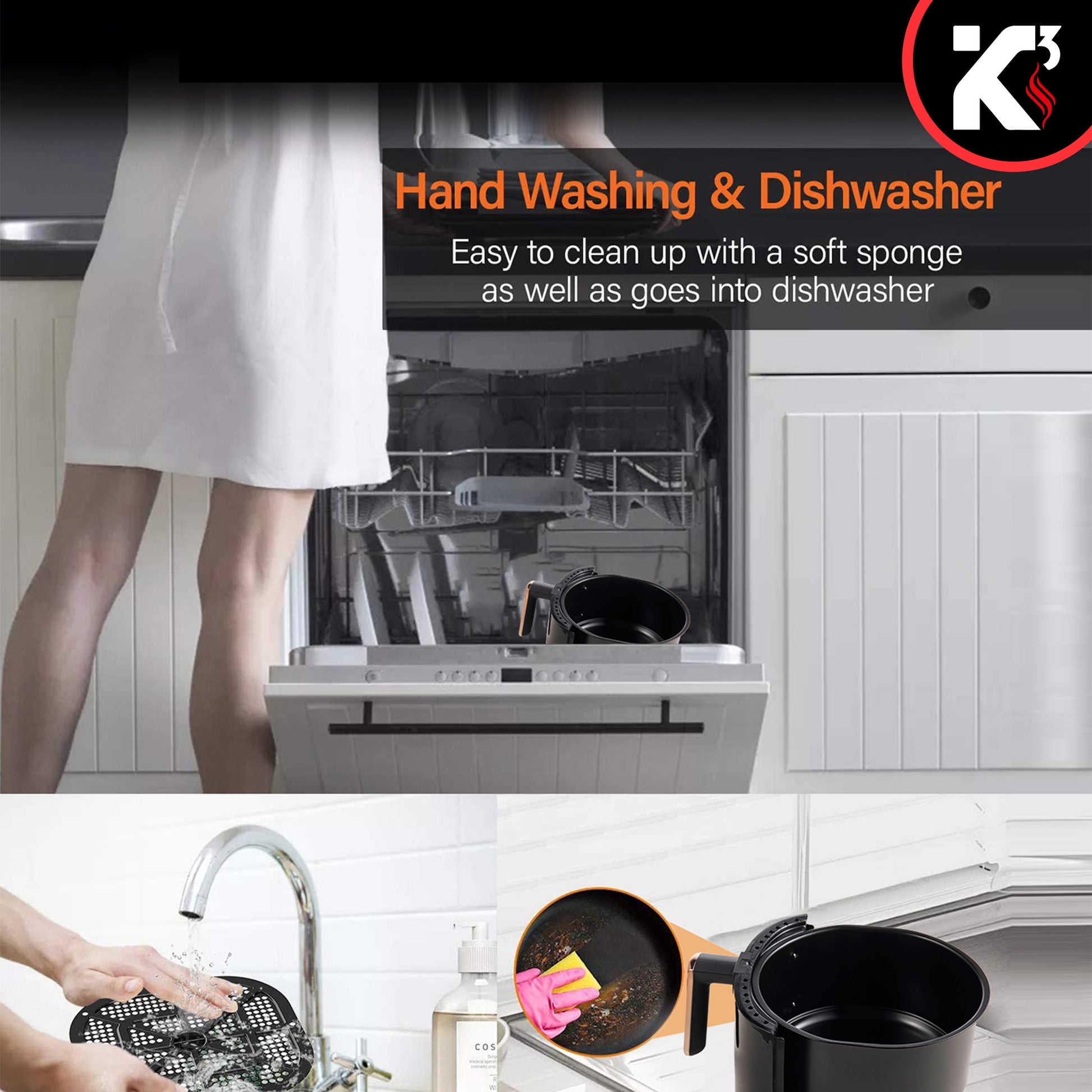 Easy clean: Cleaning this airfryer is convenient and easy because the 3-liter non-stick basket is dishwasher safe. Use gentle sponges and rags to wash the air fryer by hand to keep it in top condition. NOTE: [The air fryer is NOT a fan of abrasive sponges like brillo pads!