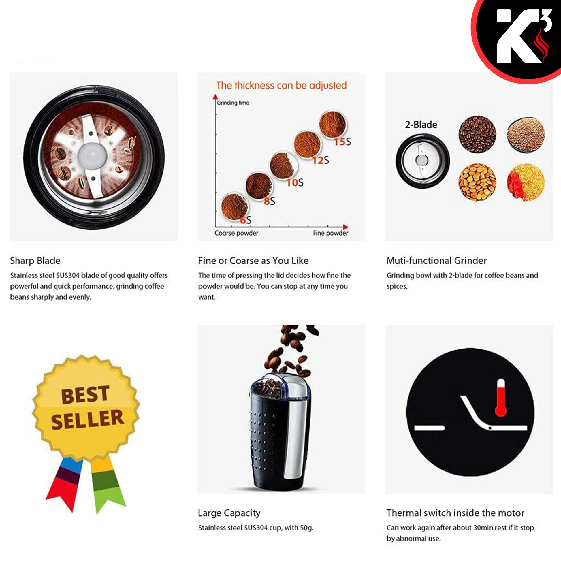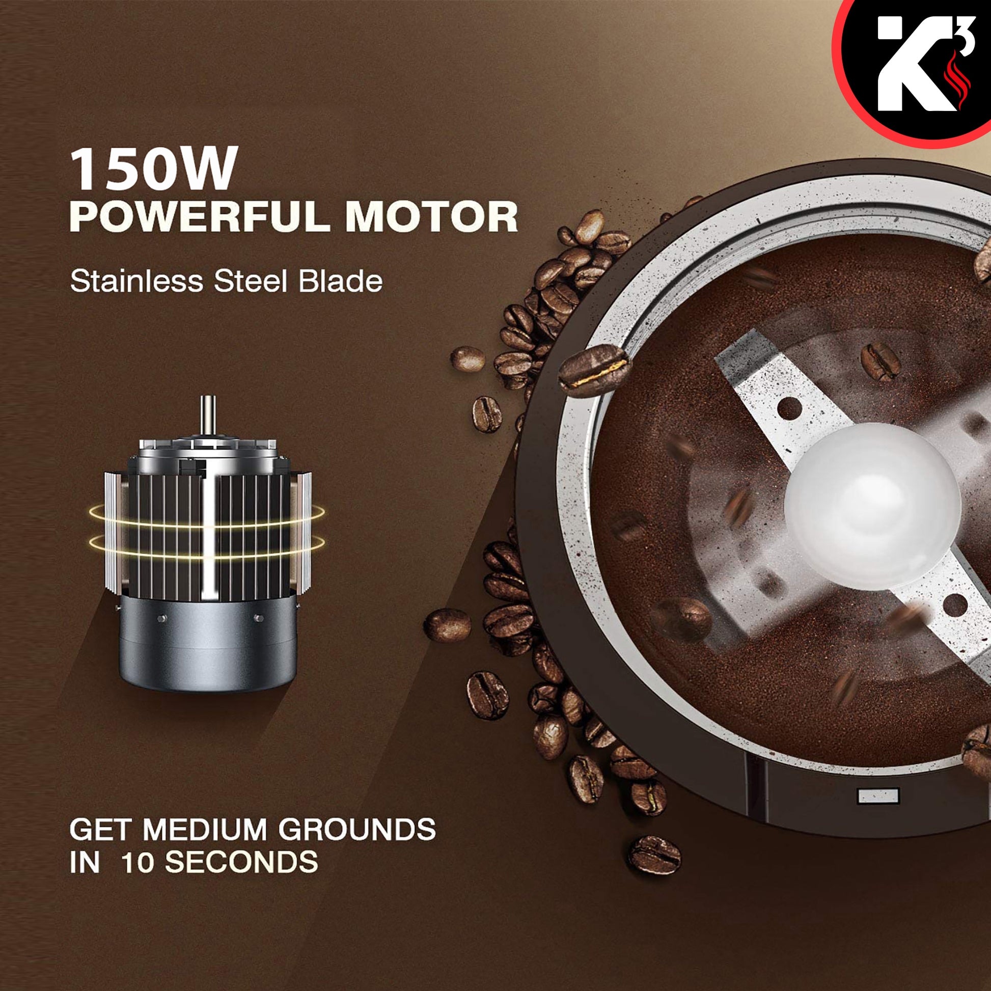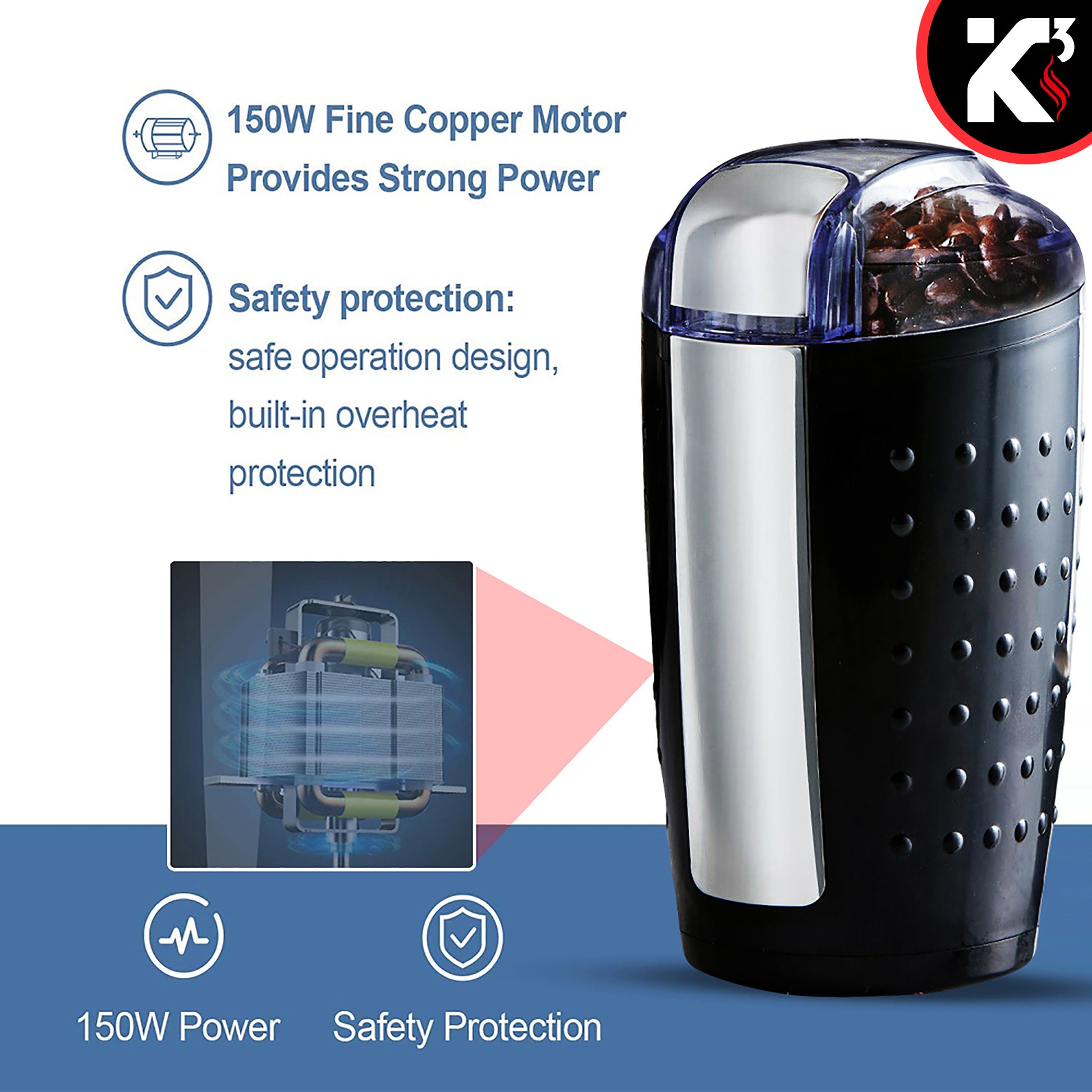 Efficient: Our coffee grinder features a 150W copper motor that grinds fast and preserves aroma; it has 35000 RPM, 75 dB max motor sound for quiet operation, and a large 50-gram capacity.