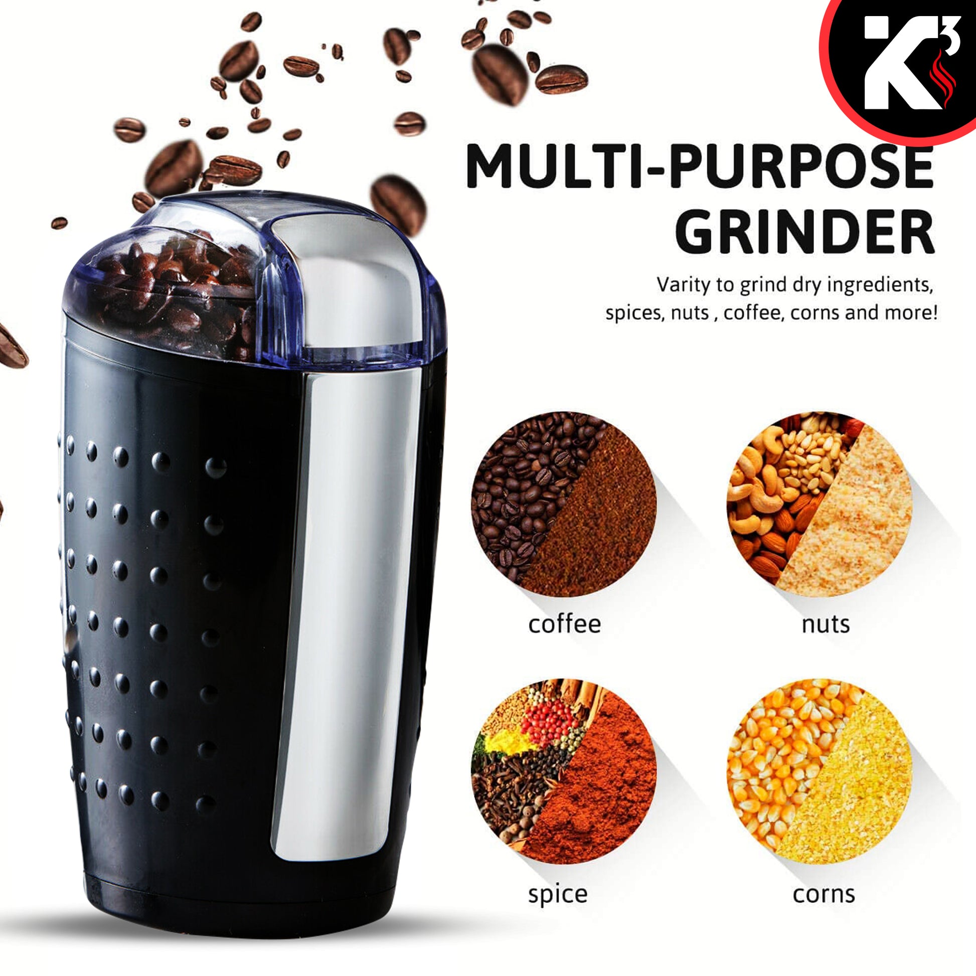 Versatile: The electric grinder boasts stainless steel blades that grind coffee beans, herbs, spices, grains, and more.